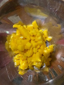 The recipe suggests 4-5 “large” mangoes will make 6 diced cups. I had 6 mangoes (I always overbuy fresh, main ingredients for canning) and that was barely enough. Maybe my mangoes weren’t “large” enough. And maybe I was too conservative in the amount of flesh I left on the pits. But IF I make it again, I will buy 7-8 mangoes. That would also allow me to choose the best/ripest ones to cut up first and leave subpar mangoes for something else.